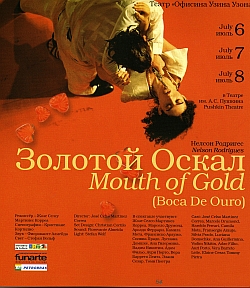 И мы привезем Нелсона Родригеса в пьесе "Золотой Оскал". Маяковский говорил: " Думаю, что где-то на Земле, может быть, в Бразилии существует один счастливый человек", а я думаю, что Маяковский нашел бы в Бразилии много счастливых людей. И вот нас привезли сюда. И я чувствую себя чеховской Ириной, которая добралась до Москвы. Я играл роль Чебутыкина, который говорил: "Мы родились ради любви". И я выкрикну вслед чеховским героям: "В Москву, в Москву!!!!" Марина Тимашева: Так Жозе Селсу говорил, а потом показывал на сцене Театра имени Пушкина то, что, скорее, можно назвать зрелищем, чем спектаклем. Называется оно "Золотой Оскал". Это современная пьеса о бразильском мафиози, который заменил все здоровые зубы на золотые, и оттого получил прозвище "золотой Оскал". Действие начинается на театральном балконе. По залу проходят ряженые артисты, некоторые в белых балахонах-сетках, другие - в масках, третьи - в золотых платьях до полу. Из-под их юбок к общему изумлению публики немедленно выползут совершенно нагие люди. Так родится и Золотой оскал. Согласитесь, такое начало обещает зрителю карнавальную ночь. Не тут-то было. Зрелище построено как репортаж. Герой убит, и журналисты получают задание разузнать жареные факты из его жизни у его бывшей любовницы. Та все время меняет показания и рассказывает три варианта одной и той же истории. В одном мерзкий ублюдок Оскал изнасиловал милую простую девушку и убил ее мужа, в другом - девушка сама навязалась почти влюбленному в ее мафиози и сама пристрелила ненавистного мужа и так далее. Сам по себе замысел довольно любопытен, потому что из разных версий события складывается определенная картина мира, в которой любой человек продаст родную мать, лишь бы сумма была предложена приличная. Второй вопрос, как этот замысел воплощен. Артисты мечутся по проходу, за ними носится репортер с камерой, и все, что попадает в объектив, немедленно проецируется на огромный экран, повешенный на сцене. Когда персонажи ссорятся, они опять выбегают в зал, прыгают по креслам, а вернее, по ногам и коленям сидящих в зале людей, плюют друг в друга, но попадают опять же в зрителей, то и дело плюхаются к ним на руки голым задом. Московская публика терпит. Правда, на участие в шоу не соглашается. Кажется, бразильцы удивились, что российские женщины не выразили желания участвовать в конкурсе на звание "Лучшая грудь". Впрочем, кто знает, что было бы, кабы призовое ожерелье из жемчуга оказалось настоящим, а не бутафорским. Бразильцы показали на театральной сцене латиноамериканский сериал, начинив его "обнаженкой" и полностью лишив родового признака жанра - сентиментальности. Говорят, что на Родине "Золотой Оскал" идет шесть часов - какой кошмар. Вся эта суета продолжалась три часа без антракта, и зал покинула бы большая часть зрителей, кабы бразильцы оставили им такую возможность. Выйти, однако, было совершенно нельзя из-за бесконечного мельтешения актеров в проходах между рядами. В рамках того же чеховского фестиваля в Театре Моссовета показали спектакль легендарного британского театра "Комплесите". Он поставлен на музыку Шостаковича Саймоном Макберни. Саймон Макберни: