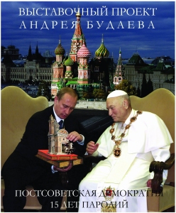 Мы с Александром уже это обсудили, что он знает только одного человека, который умеет словами описывать картины, - это Набоков. Я не Набоков, поэтому, уж извините меня, пожалуйста, попробую описать так, как можно это в радиоэфире сделать, коротко, наиболее, может быть, понятными штрихами. Потому что, конечно, неблагодарная задача - описывать картины. Вот из невинного. Человек во фраке на фоне старушек и палаток с женским бельем с надписью фирмы "Псарьки". Стоит себе, такой похожий на официанта в третьеразрядном ресторанчике, то ли, может быть, на швейцара, а может быть и на полового. Через руку перекинуто полотенце из российского триколора. Служивый этот человечек имеет лицо премьер Фрадкова. Или еще - Икар с лицом благостного Касьянова в минутной готовности перед взлетом, которого то ли поддерживает, то ли посылает в полет босоногий Невзлин. Из страшного и почти шокирующего. Лицо опального олигарха Ходорковского заменило лицо окровавленного, распятого Христа из фильма Мела Гибсона. На кресте надпись: "Открытая Россия".